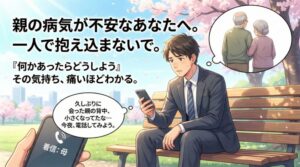 - 親に電話して「最近体調どう?」と聞く。チェックリストのうち「健康状態」の確認から始める。難しいことは何もない。ただ電話するだけでいい。